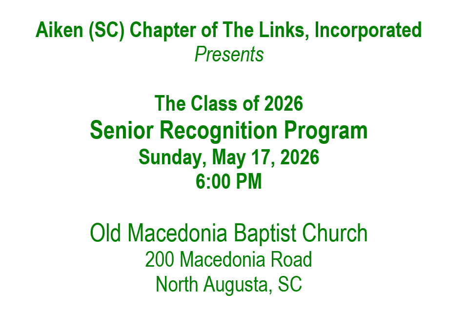 Each year the Aiken Chapter of The Links, Incorporated recognizes outstanding high school seniors and awards them scholarships and/or certificates of achievement. This event is funded by the generous donations and support of Aiken businesses, community leaders, and the Aiken Chapter of The Links, Incorporated. Our scholarship program celebrates African American students in the areas of ACADEMICS, ARTS, ATHLETICS, CHARACTER, and SERVICE.